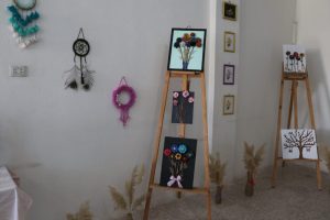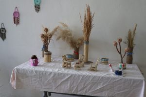 تضمن المعرض منتجات يدوية متنوعة تشمل لوحات فنيّة, ومشغولات يدوية مُطرّزة ومنتجات أُخرى من الأسلاك الحديدية والخشب والبلاستيك، إلى جانب مجسمات منازل مصنوعة من الخرداوات المنزلية كعلب الكولا والمواد المكررة.